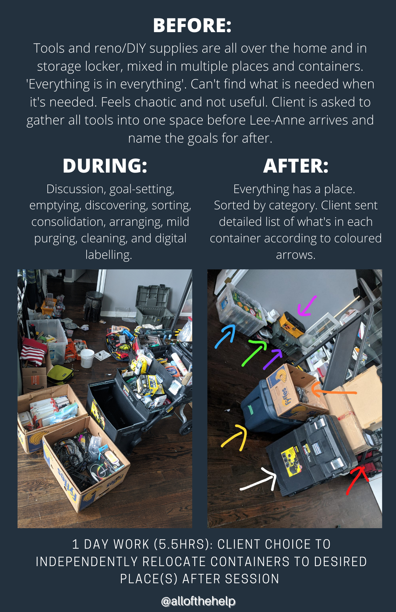 As she said in a feedback form: “Lee-Anne was able to make sense of the mess, and brought order to our chaos. We were able to have at hand tools in our unit, and tuck the rest away in storage!”