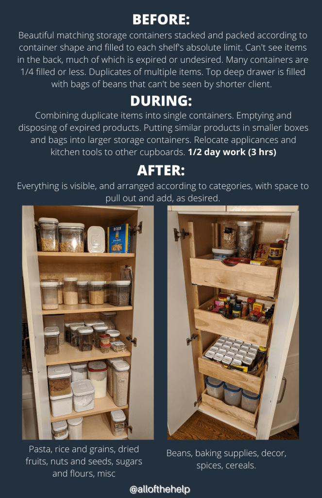 In a short session, Erika’s cupboards were emptied, duplicates were consolidated, bakeware and appliances were removed and joined similar items in other areas of the kitchen and we purged ingredients that were expired or not being used. As she said in a feedback form: “The best aspect was the thoughtful and respectful way [Lee-Anne] went about defining what could be done and getting my buy-in before beginning to re-organize.