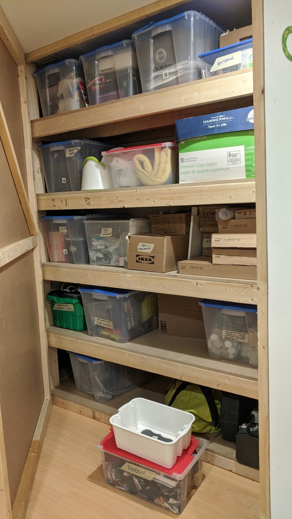 Their goal was to have everything out of cardboard boxes and into labelled buckets and bins that the shelves had been designed and purpose-built for.
